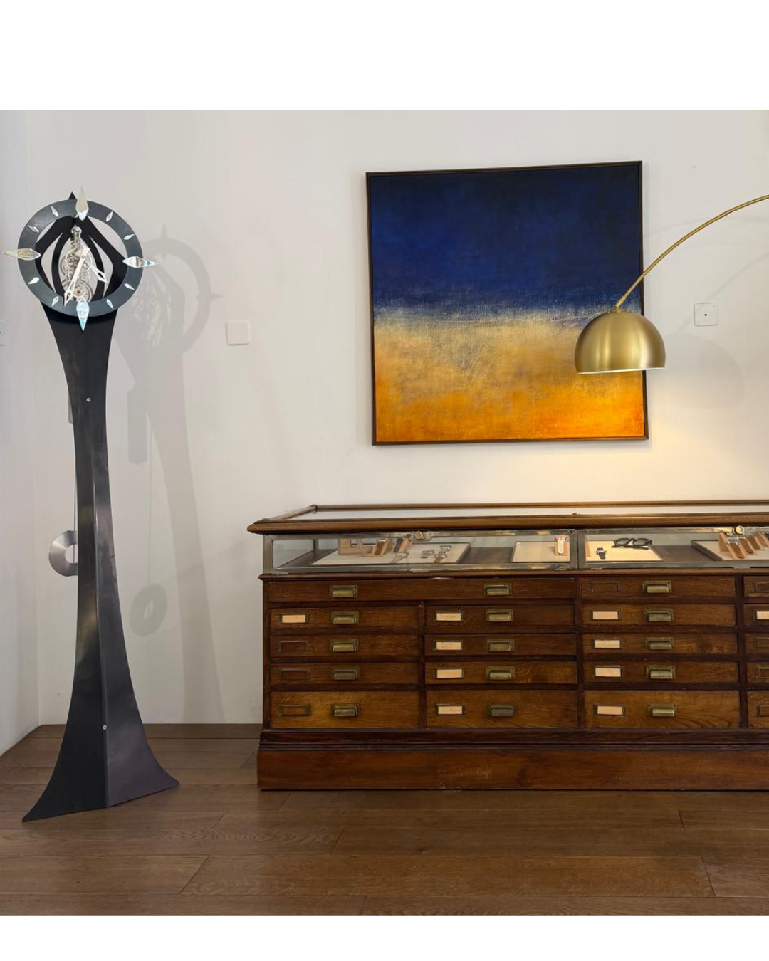 This connection is particularly striking with our Series S. The minimalism of our monochrome, sunray-finished dials seems to extend naturally into Laurent’s canvases. One finds the same nuances, the same interplay of light, and the deep tones that define Elka’s visual identity. By displaying these works alongside our watch collections, Utinam clocks, and Moscot eyewear, we offer our visitors a complete sensory experience. It is an invitation to slow down and observe the passage of time—not only through the movement of hands on a dial but through the layers of color and texture created by an artist who has explored the world’s sensitivity for over fifty years.